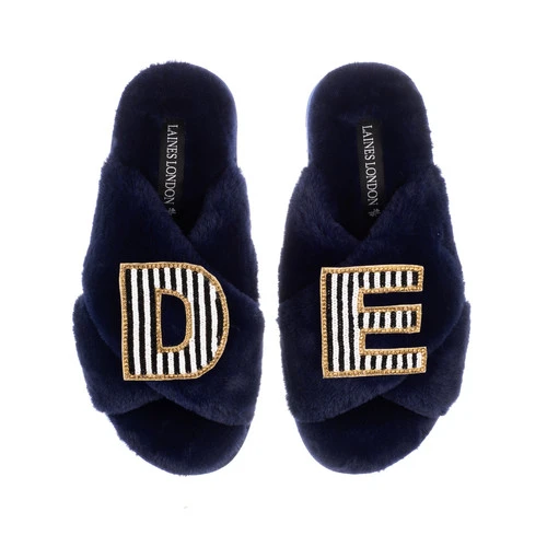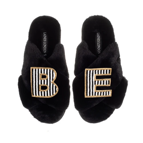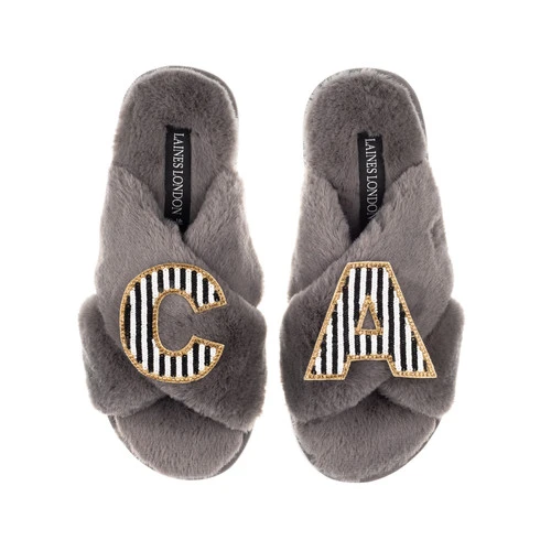 Classic Laines Slippers With Black & White Stripe Double Initial Brooches