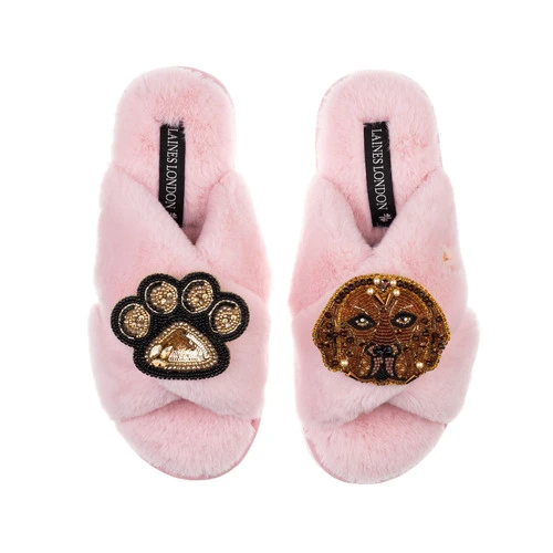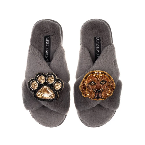 Classic Laines Slippers With Rocco The Chocolate Lab & Paw Brooches