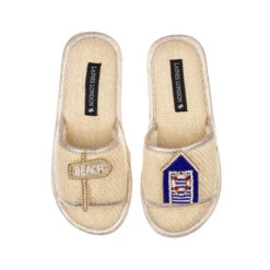 Straw Braided Sandals With Black & White Stripe Initial Brooches