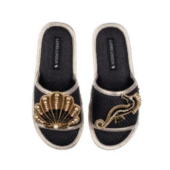Straw Braided Sandals With Black & Gold Shell & Seahorse Brooches