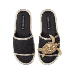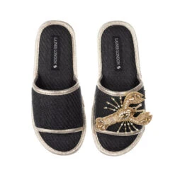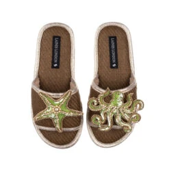 Straw Braided Sandals With Green & Gold Starfish & Octopus Brooches
