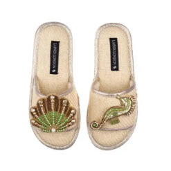 Straw Braided Sandals With Green & Gold Shell & Seahorse Brooches