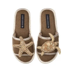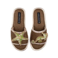 Straw Braided Sandals With Green & Gold Starfish & Seahorse Brooches