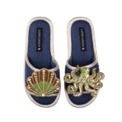 Straw Braided Sandals With Green & Gold Shell & Octopus Brooches