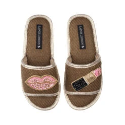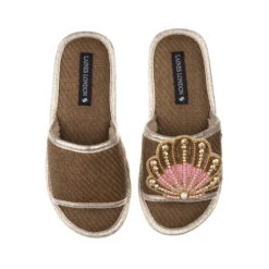 Straw Braided Sandals With Pink & Gold Shell & Lobster Brooches