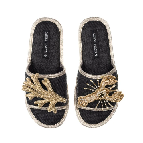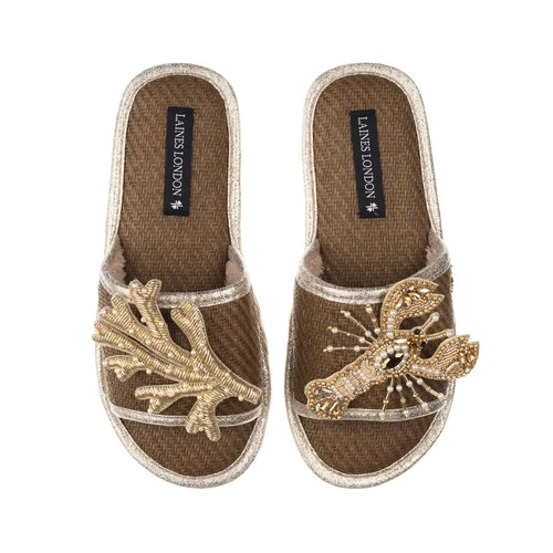 Straw Braided Sandals With Gold Lobster & Coral Brooches