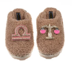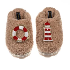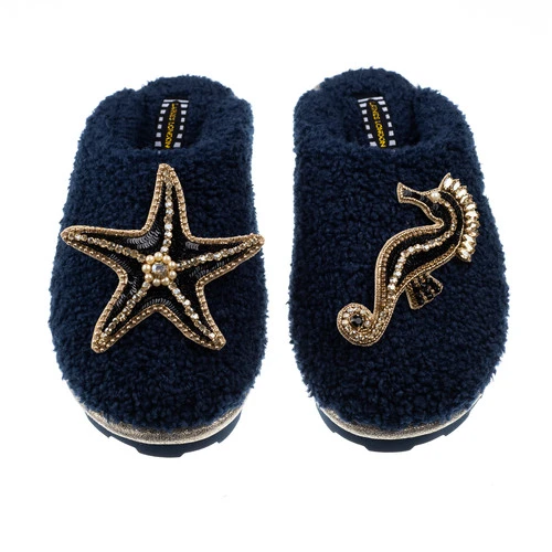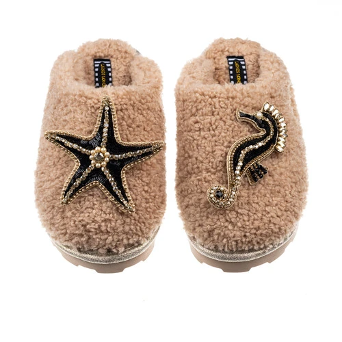 Teddy Closed Toe Slippers With Black & Gold Starfish & Seahorse Brooches