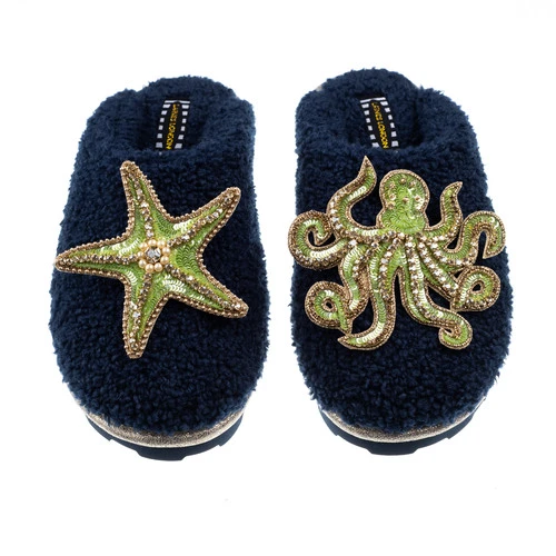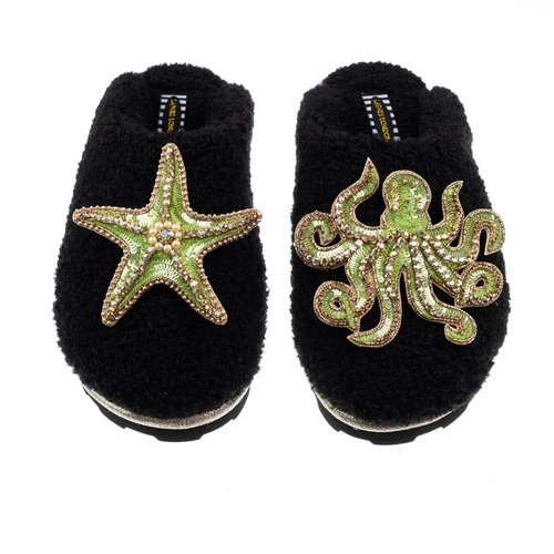 Teddy Closed Toe Slippers With Green & Gold Starfish & Octopus Brooches