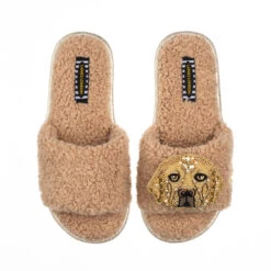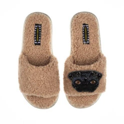 Teddy Towelling Slipper Sliders With Taurus Star Sign Brooches