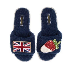 Teddy Towelling Slipper Sliders With Strawberry & Union Jack Brooches
