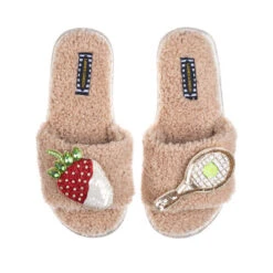 Teddy Towelling Slipper Sliders With Strawberry & Tennis Brooches