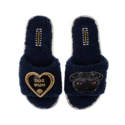 Teddy Towelling Slipper Sliders With Tennis & Union Jack Brooches