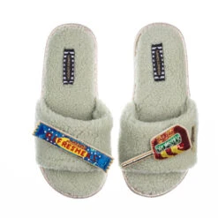 Teddy Towelling Slipper Sliders With Coffee & Croissant Brooches