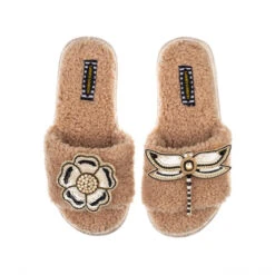 Teddy Towelling Slipper Sliders With Dragonfly & Flower Brooches