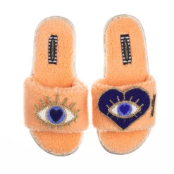 Teddy Towelling Slipper Sliders With Double Blue Eyes Brooches
