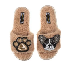 Teddy Towelling Slipper Sliders With Coco & Dog Mum Brooches