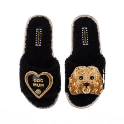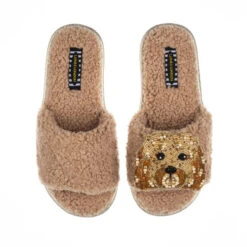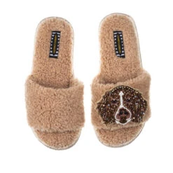 Teddy Towelling Slipper Sliders With Enki Doo & Paw Brooches