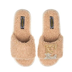 Teddy Towelling Slipper Sliders With Gold & Silver Initial Brooch